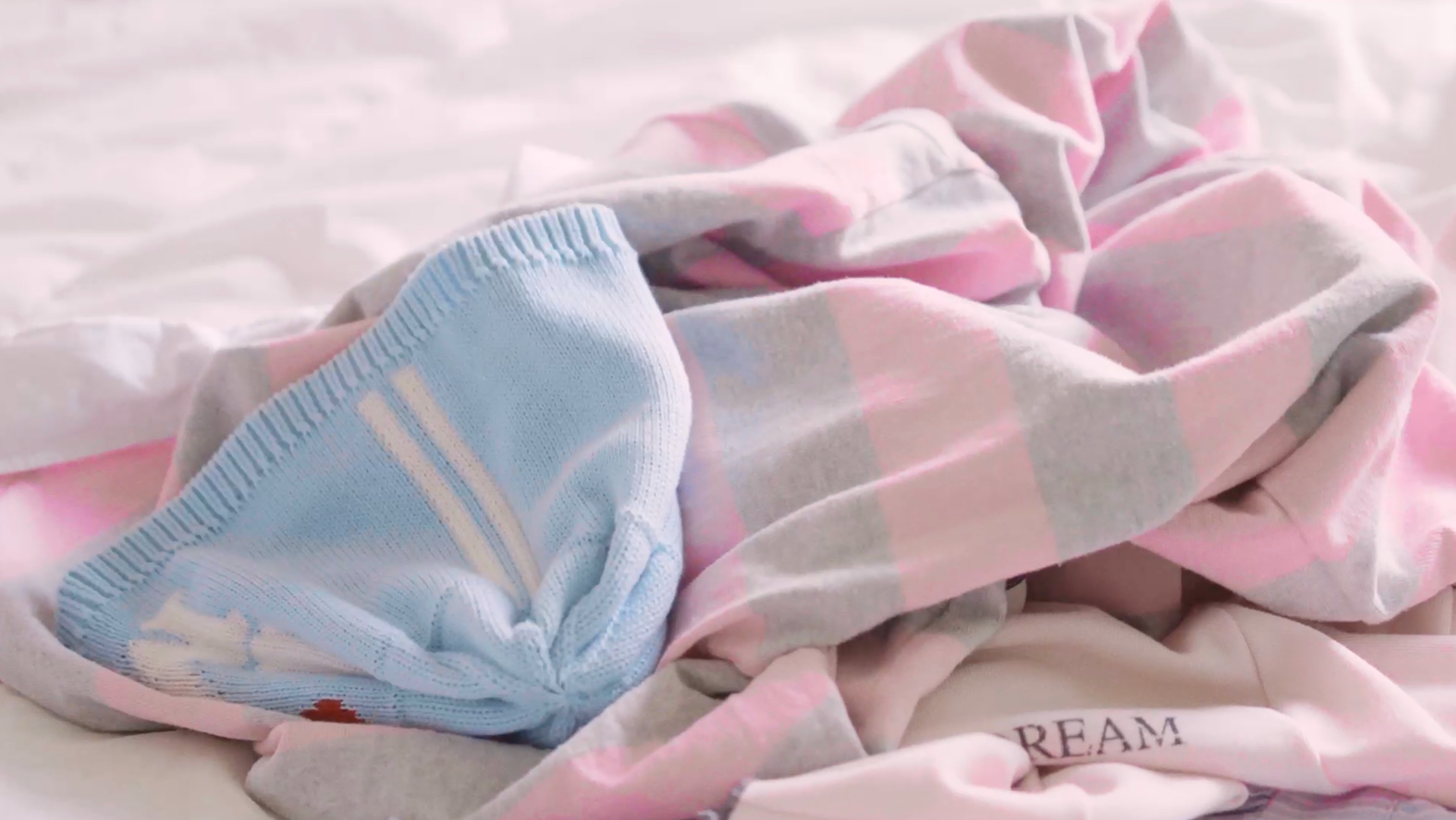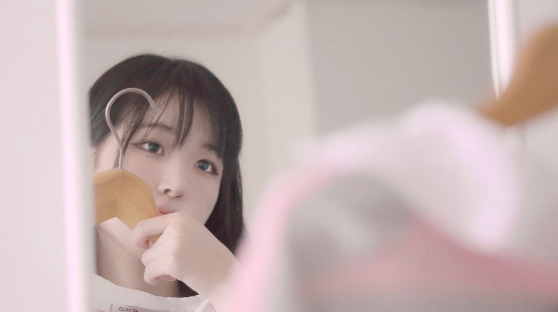 옷들을 펼쳐놓고, 몸에 대 보기도 하며 다양하게 코디해 보는 릴서.